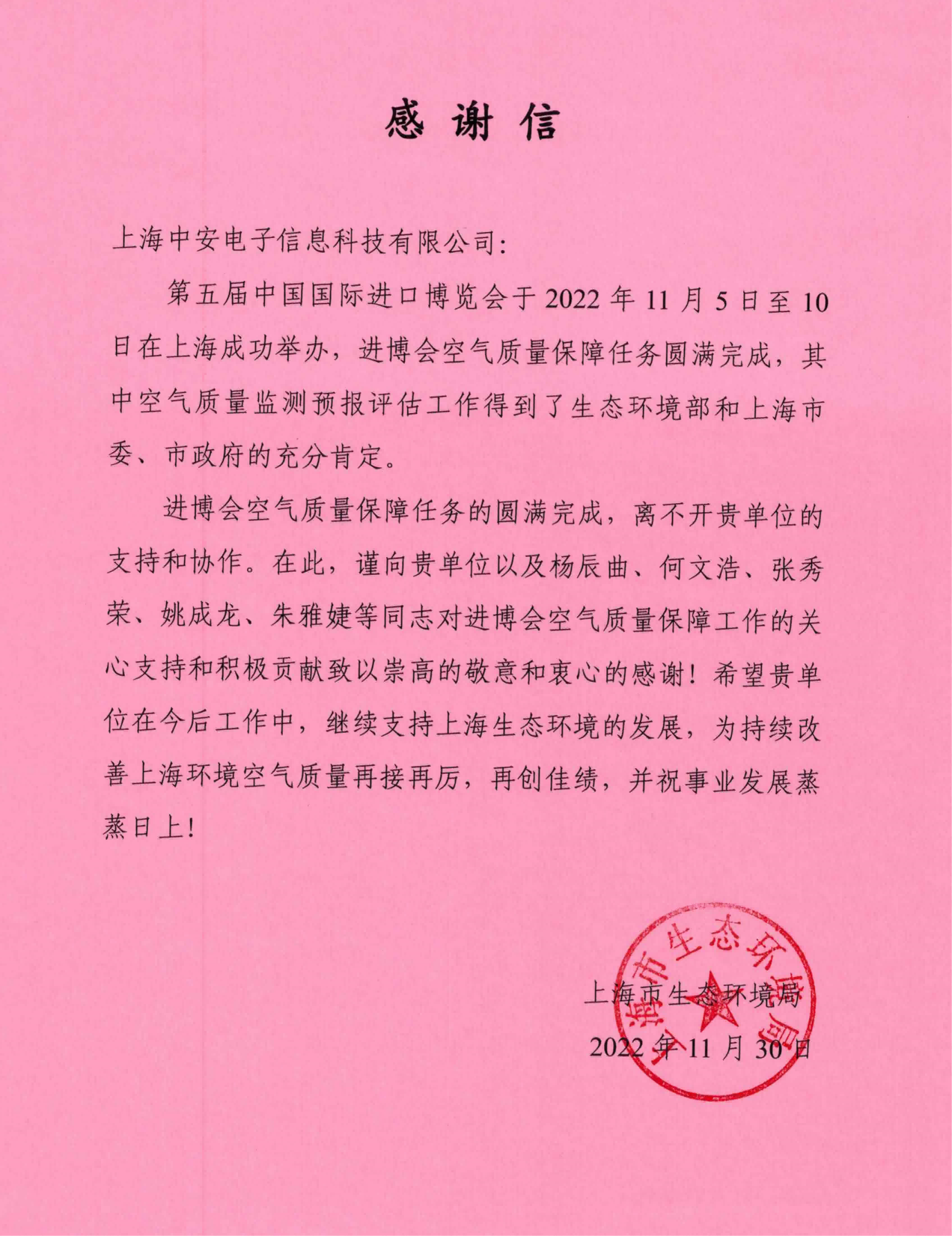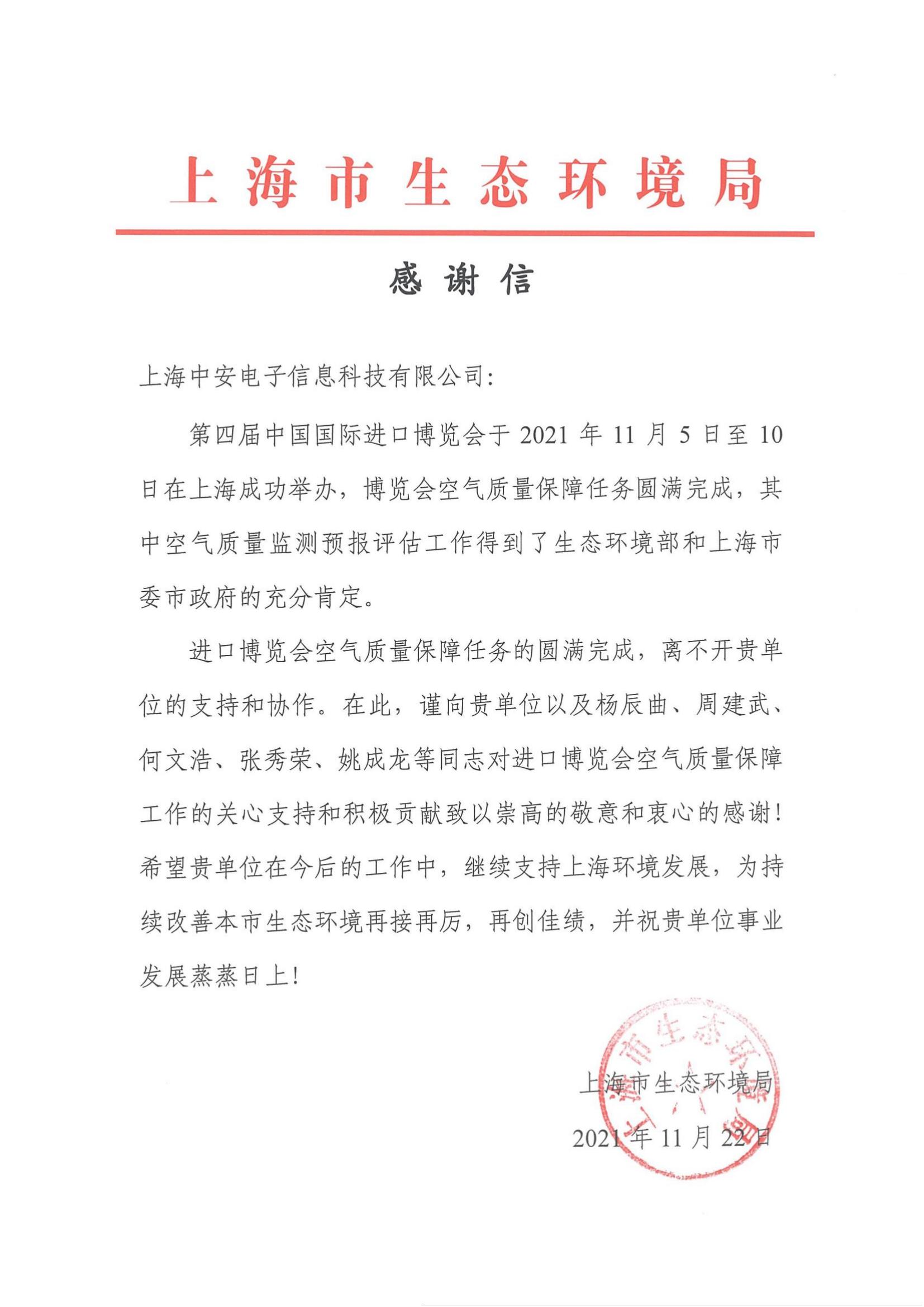 上海環(huán)監(jiān)中心就中安科技在21年國(guó)際進(jìn)博會(huì)空氣質(zhì)量監(jiān)測(cè)預(yù)報(bào)工作中杰出貢獻(xiàn)送來(lái)感謝信!(2021/12/31)